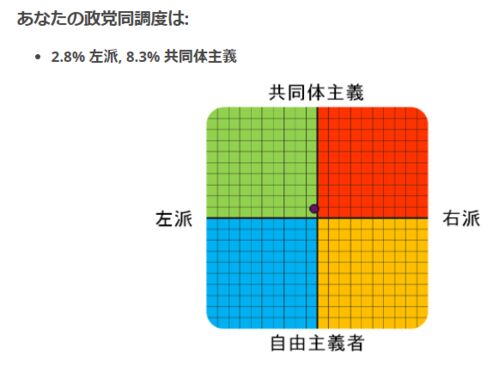 政治や経済の分野では保守/革新、右派/左派、全体/個人といった2項での分類を用いることが一般的です。そういった2項での分類を示すツール、政治的スペクトルを点数化して二次元座標に表したものをポリティカルコンパスと言います。 私の立ち位置 ポリティカ…